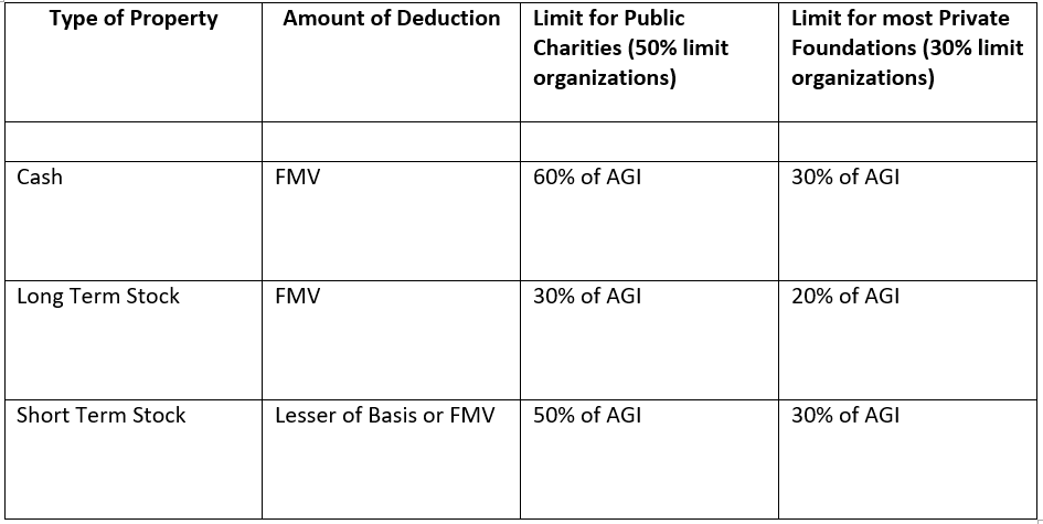 Charitable contributions are allowed in full if they are not more than a certain percentage of the taxpayer’s AGI. Different types of property donated have different AGI limits explained in the chart below